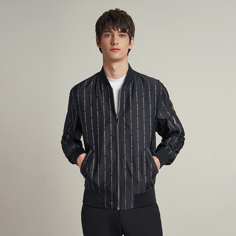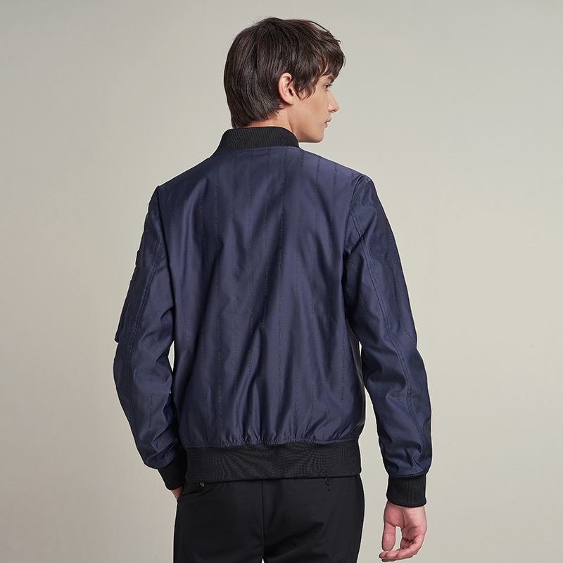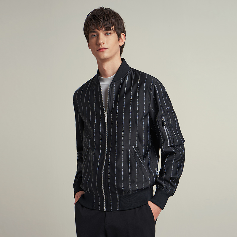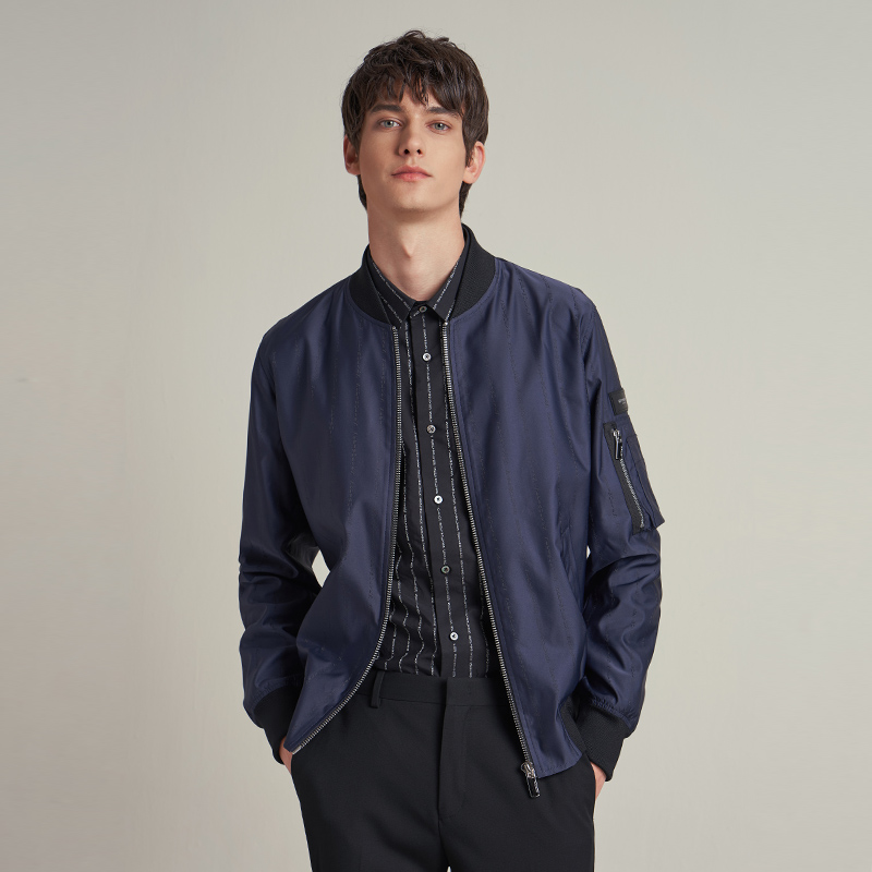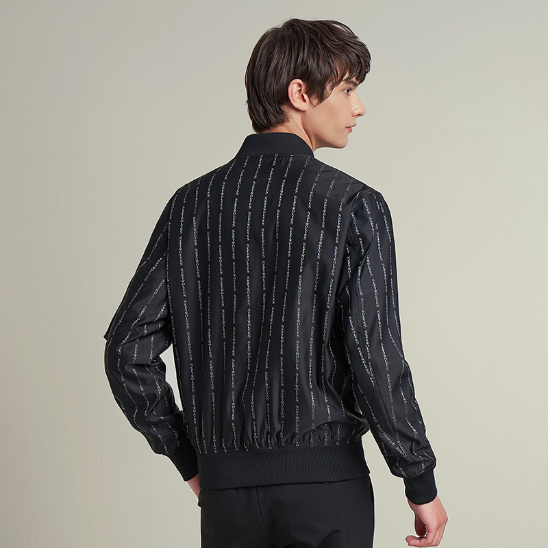 此款为棒球领单夹克,双色梭织提花面料,由精细文字组成的条纹形状图案,跳开常规刻板的条纹更具新颖,斜插口袋隔断条的规整性及航空服袖袋设计,具时装感。